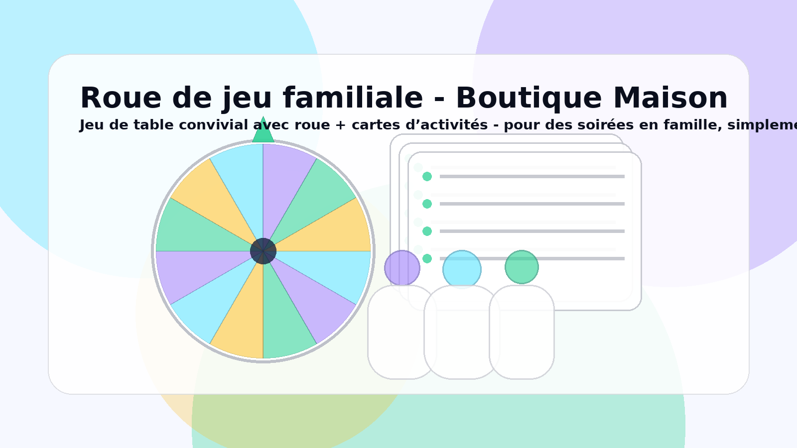 ValeurLa roue apporte un rythme naturel - on tourne, on découvre une activité, puis on joue ensemble. Les cartes sont pensées pour alterner énergie et calme, afin de garder une ambiance agréable.